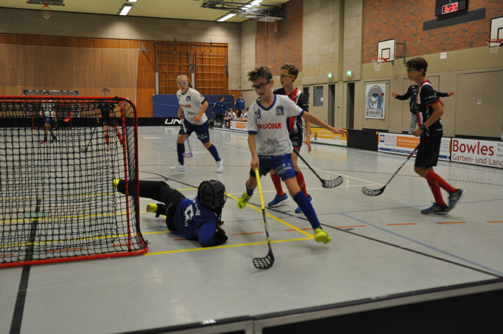 Direkt im Anschluss standen die Heljens Haie dem vermeintlichen Favoriten aus Bonn gegenüber. Die Bonner hatten sich in ihrem ersten Spiel gegen Refrath ordentlich Selbstvertrauen angeschossen und über 20 Tore erzielt. Das Spiel begann unmittelbar nach dem Anpfiff angriffsstark, Bonn mit leichtem Vorteil. Doch der Haie-Goalie glänzte mit einer Parade nach der anderen. Dies gab dem gesamten Team Sicherheit und Antrieb, so dass auch die Haie mutiger nach vorn spielten. Der Mut wurde mit 2 Toren belohnt. Kurz darauf gelang es Bonn jedoch diese Führung wieder auszugleichen. Doch die Haie wollten mehr und erhöhten auf 7:2. Bonn ließ sich dadurch aber nicht verunsichern. Durch eine Kontersituation nach der anderen, kamen sie abermals ran und schafften kurz vor dem Ende sogar noch den Ausgleich zum 7:7.