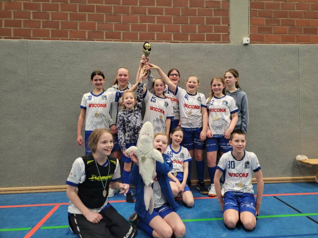 Zurück aus der Halbzeitpause musste das Tor der Haie erstmal verteidigt werden. Das gelang mit starken Paraden. In der vierten Spielminute verwandelte unsere Mannschaft das 8:2 – die Holzbüttgener verkürzten den Abstand auf 8:3 mit einem druckvollen Tor in der sechsten Spielminute. Aber kräftige Torschüsse können die Haie auch und schon stand es 9:3. Dann ging der leuchtend orange Ball so schnell in die Netze, das die Zuschauer Mühe hatten, dem aktuellen Spielstand zu folgen. Der gegnerischen Mannschaft gelangen zwar noch zwei Tore, aber dann waren die Haie nicht mehr aufzuhalten. In Spielminute 16 Freischlag für die Haie – Spielstand inzwischen bei 13:5. Eine letzte sensationelle Parade der Haie-Keeperin und dann noch mal eben zwei Tore vor dem Abpfiff. Mit einem Endstand von 15:5 setzten die Haie ein deutliches Ausrufezeichen und unterstrichen, was eigentlich schon vor dem Spiel klar war. Der NRW Meistertitel für die U13 RL geht an das Team aus Heiligenhaus! Strahlende Gesichter. Ein großer Dank an die Trainer und Betreuer Tanja, Bela und Leo.