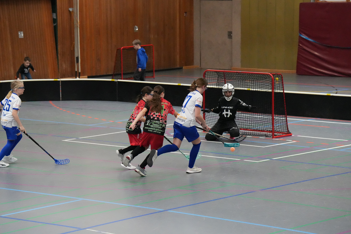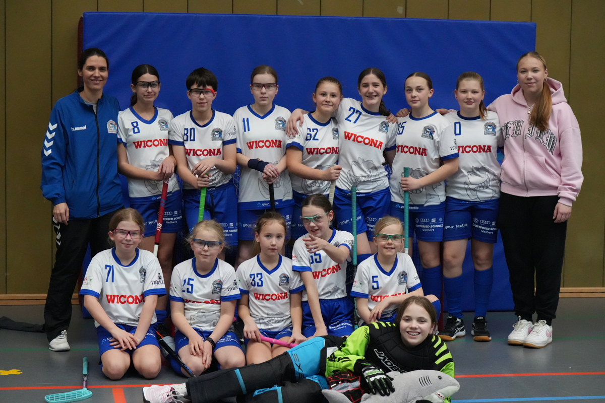 Im ersten Spiel ging es für die Heljens Haie gegen die SSF Dragons Bonn. Die ersten Spielminuten fanden hauptsächlich in der Hälfte der Dragons statt, aber die Haie wirkten noch etwas vorsichtig. Die Bonner zeigten eine gute und effektive Abwehr. Ab der vierten Spielminute wurde es lebhafter, beider Mannschaften wechselten in den Angriffsmodus. In der 6. Spielminute fiel das erste Tor – für die Heljens Haie! Die Dragons starteten zum Gegenangriff, aber die Torhüterin der Haie hatte ihre Paraden im Griff. Jetzt machten auch die Haie zunehmend mehr Druck. Aber auch das Tor der Gegner war gut bewacht. Die ein oder andere Ungenauigkeit beim Passen auf Seiten der Heiligenhauser nutzten die Bonner Mädchen direkt aus. In der elften Spielminute schossen sie den Ausgleich. Die Haie kämpften, gerieten aber leicht unter Druck. In solchen Situationen zahlt sich eine routinierte Torhüterin aus, die unserer Mannschaft den Kasten frei hält. In Spielminute 13:36 gingen die Haie mit 1:2 in Führung und gut dreißig Sekunden später fiel das etwas überraschende 1:3, durch eine Ungenauigkeit der Bonner Torhüterin. Nun hatten die Haie Auftrieb. Aber auch die Dragons zeigten Biss und verkürzten zum 2:3 in der 15. Spielminute. Die Abwehr der Haie war daraufhin etwas zu durchlässig und prompt schafften die Bonner den Ausgleich. Aber das Heiligenhauser Team ließ sich nicht entmutigen. „Jetzt erst recht“ war die Devise. Nach zwei lässigen Toren stand es dann schnell 3:5. Aber die Dragons blieben dran. Der Halbzeitstand lautete 4:5. In der ersten Halbzeit hatten die beiden Teams auf Augenhöhe gespielt.